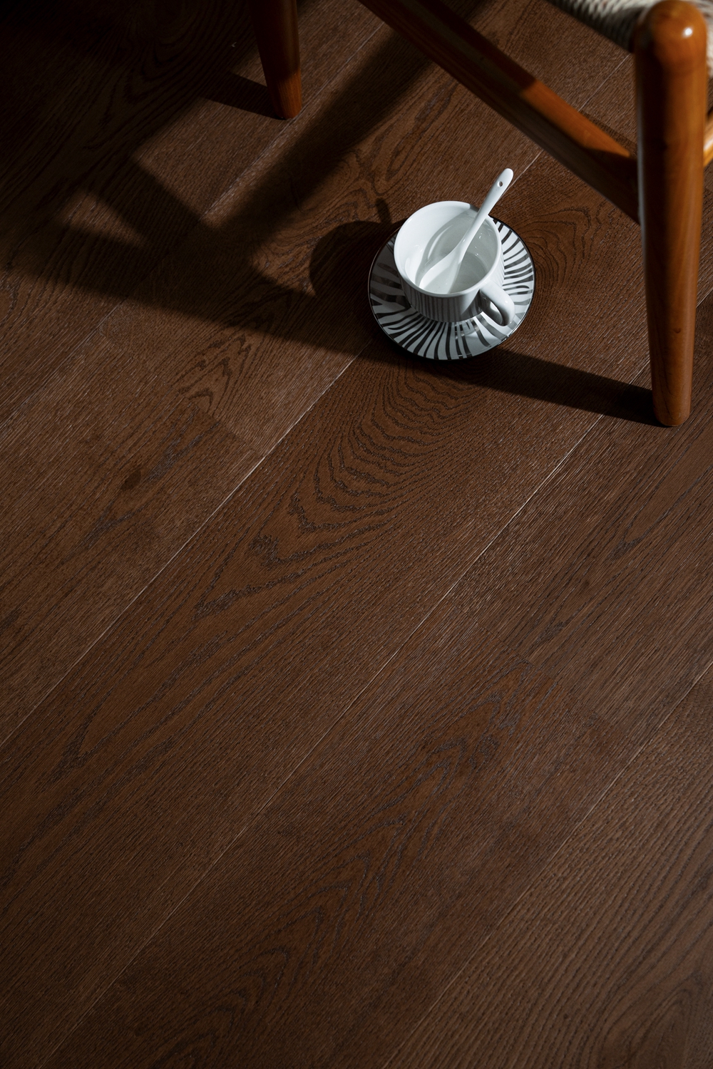 深邃浓郁的棕色,宛如历经岁月沉淀的珍贵木质,展现出强烈的复古气息和自然魅力。天然色差与节疤点缀出自然的野性质感。赤足行走,木纹起伏间仿佛触摸到森林的呼吸,这种款地板的适配性极强,无论是中古风、老钱风还是美德拉风格,它都能完美融入。