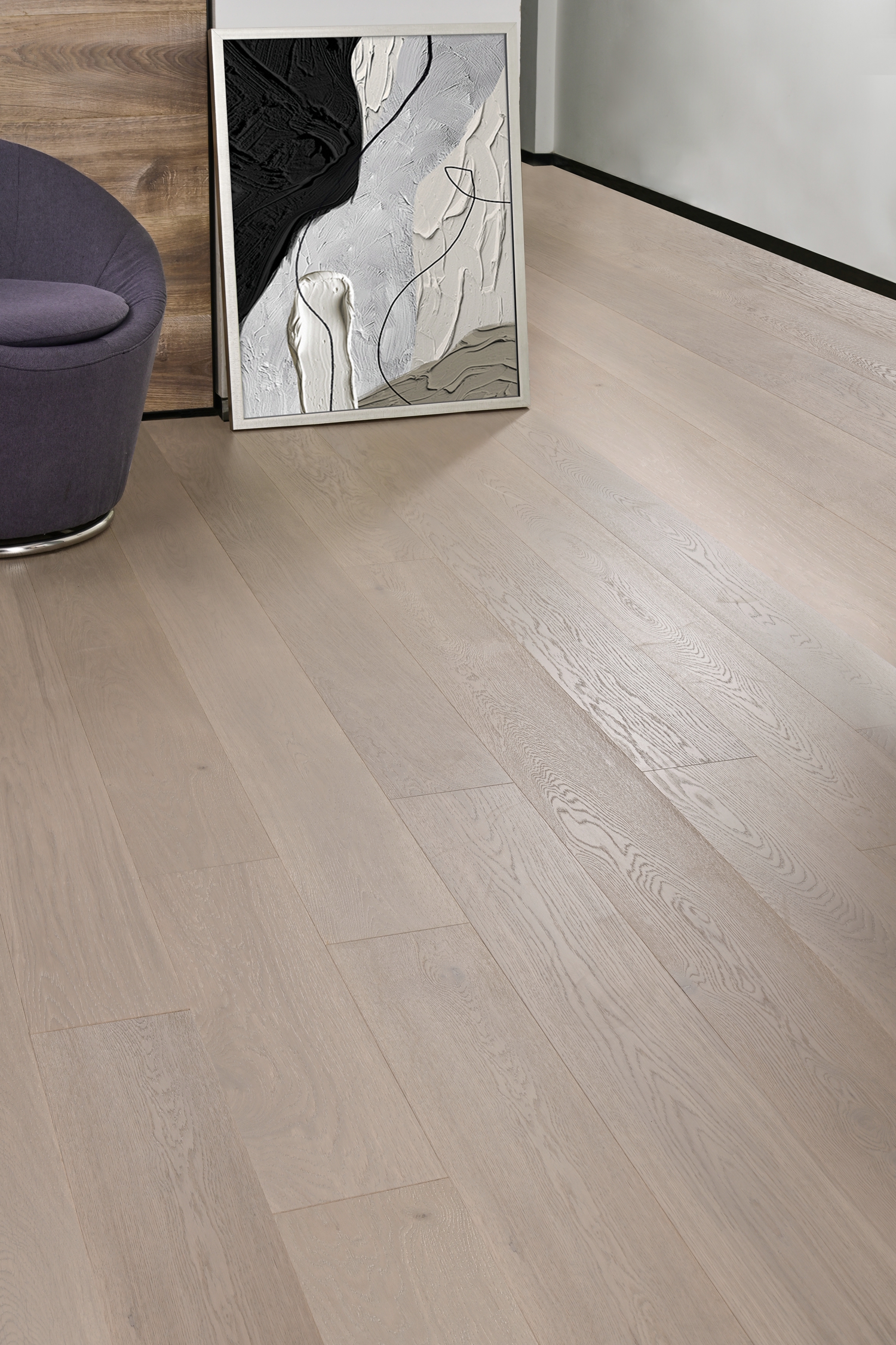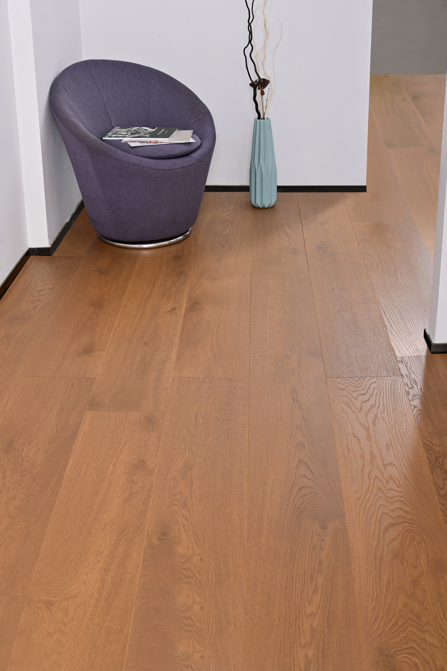 金钢铂林Ecco Flooring的顶层、芯层与底层均采用橡木材质,摒弃了传统三层实木常用的较软松木芯材。橡木本身对形变的抵御能力更强,以此为芯材,大幅提升了板材整体的稳定性能。