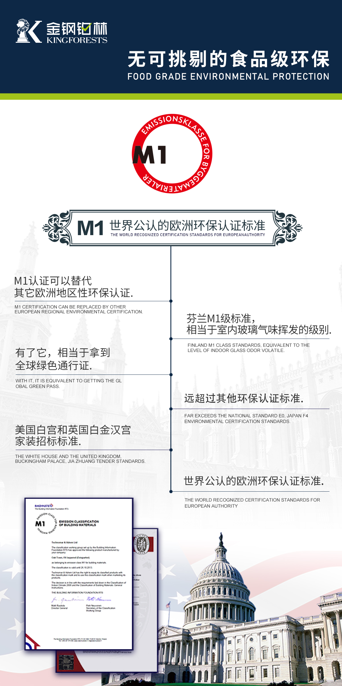芬兰M1认证是公认为世界上更严格、更苛刻的产品认证标准,该认证分为M1、M2、M3三个级别,其中M1为最高级别,相当于室内玻璃气味挥发的级别,达到了食品、制药级标准,受到国际范围的广泛认可,成为美国白宫和英国白金汉宫内墙装饰招标的首要标准。