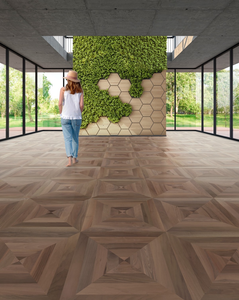灵感来自南美洲的大自然风景,其葱郁蓬勃的景象未受破坏。高冲击力的效果是由橡木和亚洲柚木的巧妙互动创造而出,仿佛枫叶洒落一地,宛如来自埃舍尔的雕刻作品。