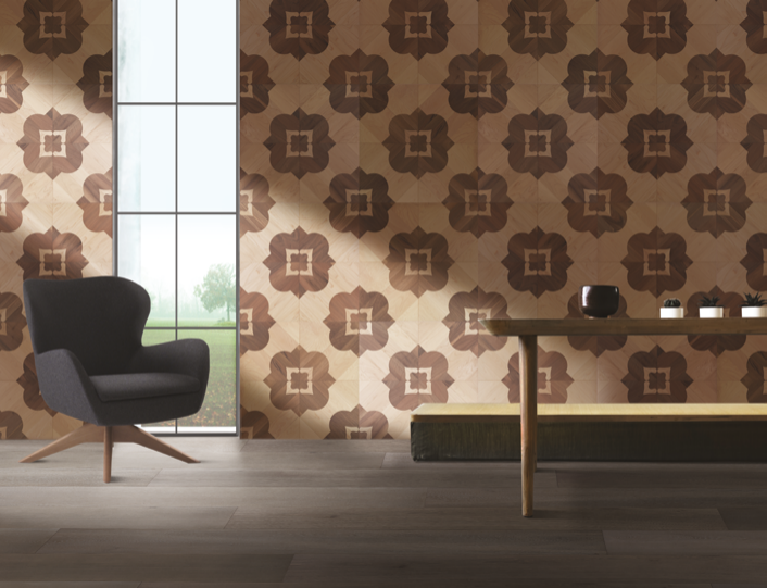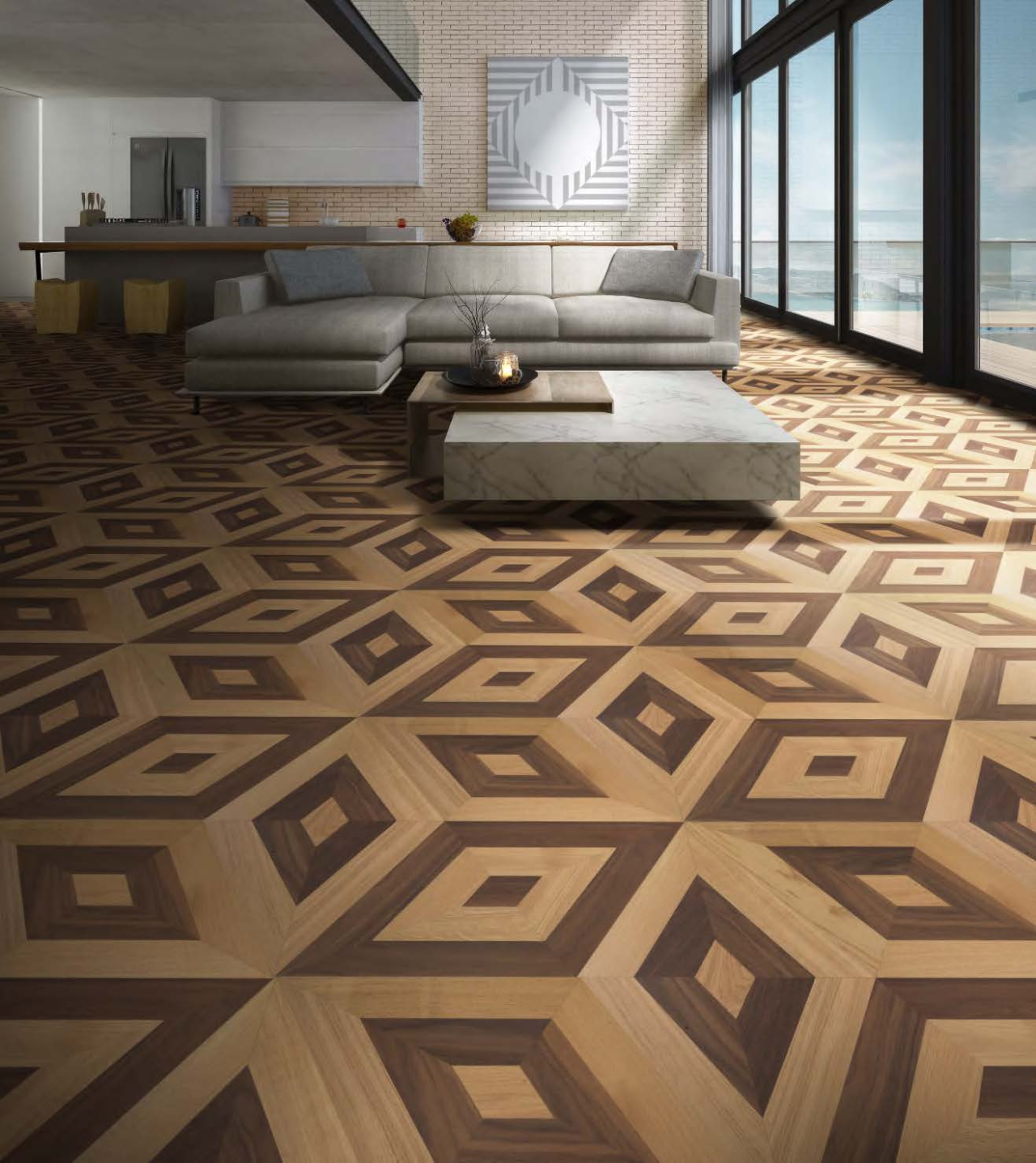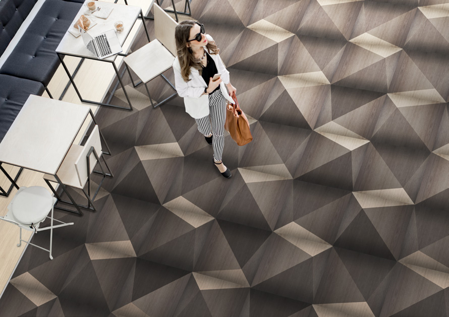 Berti木地板与Diesel Living的创意团队合作,共同设计了一系列渐变几何图案,通过数字印刷技术为地板艺术带来令人惊叹的图案效果及动感。