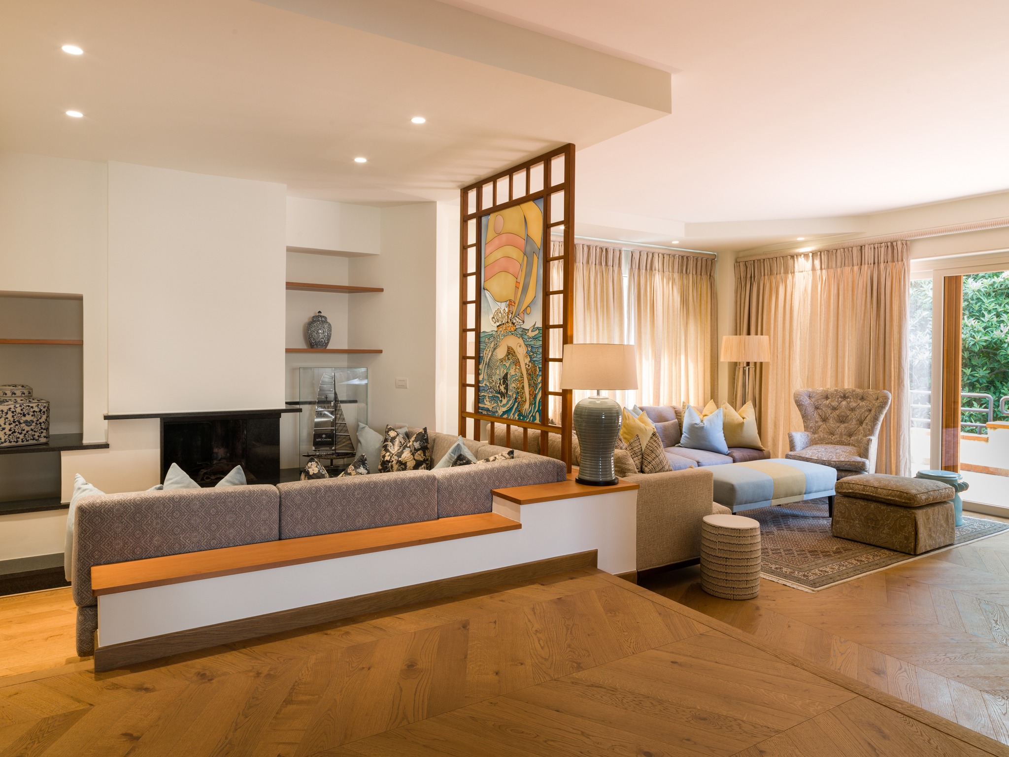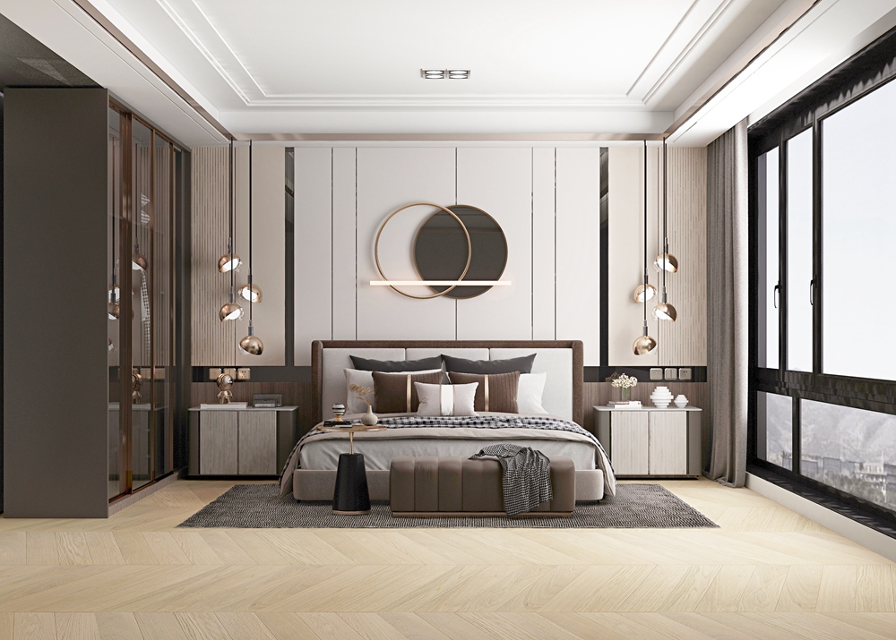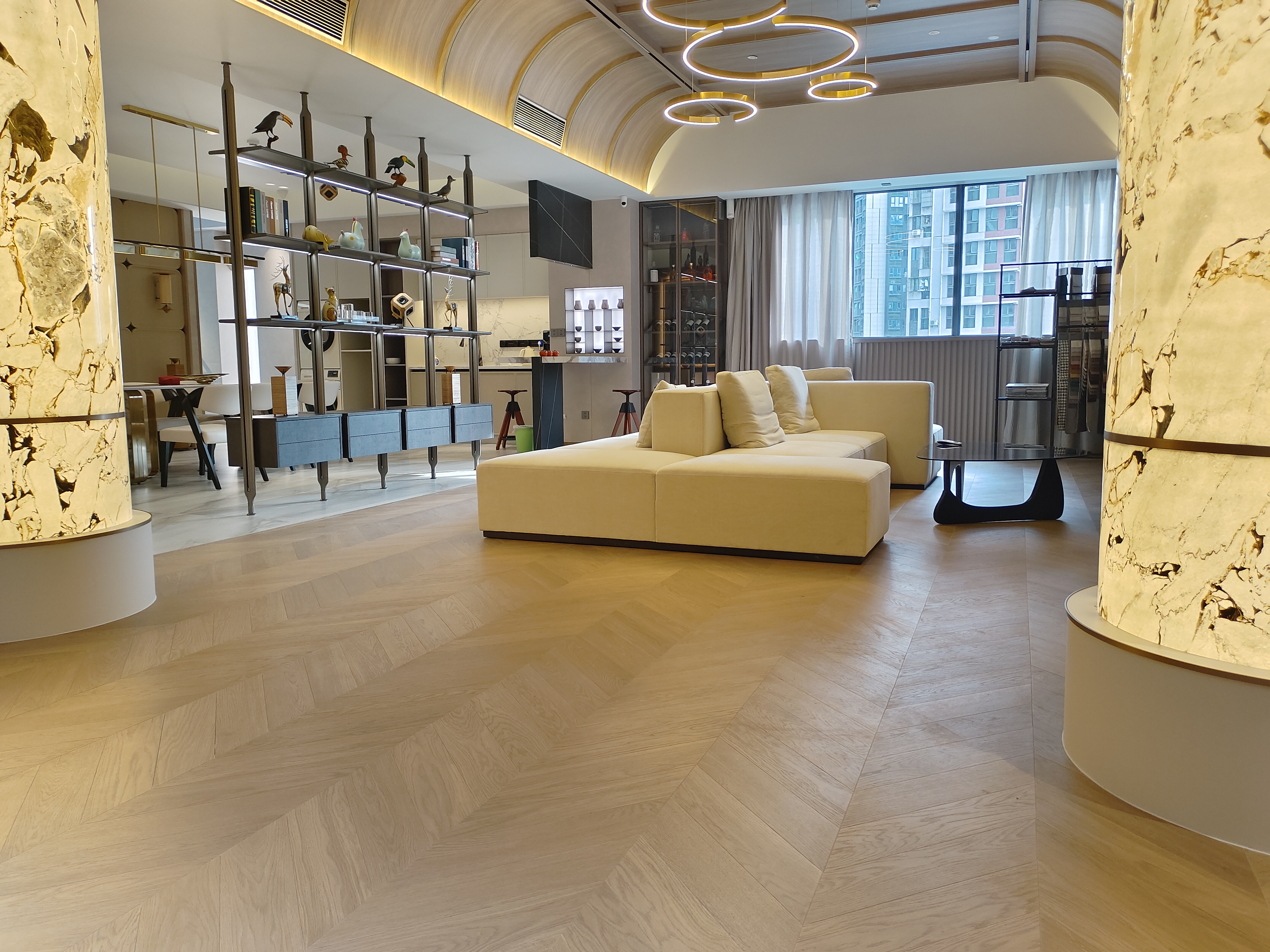 比起横平竖直的拼接方法,鱼骨拼地板的几何属性,让地面外观整齐,排列错落有致,大气又独具个性,给人复古又时尚的美,奠定了整个空间的艺术格调。