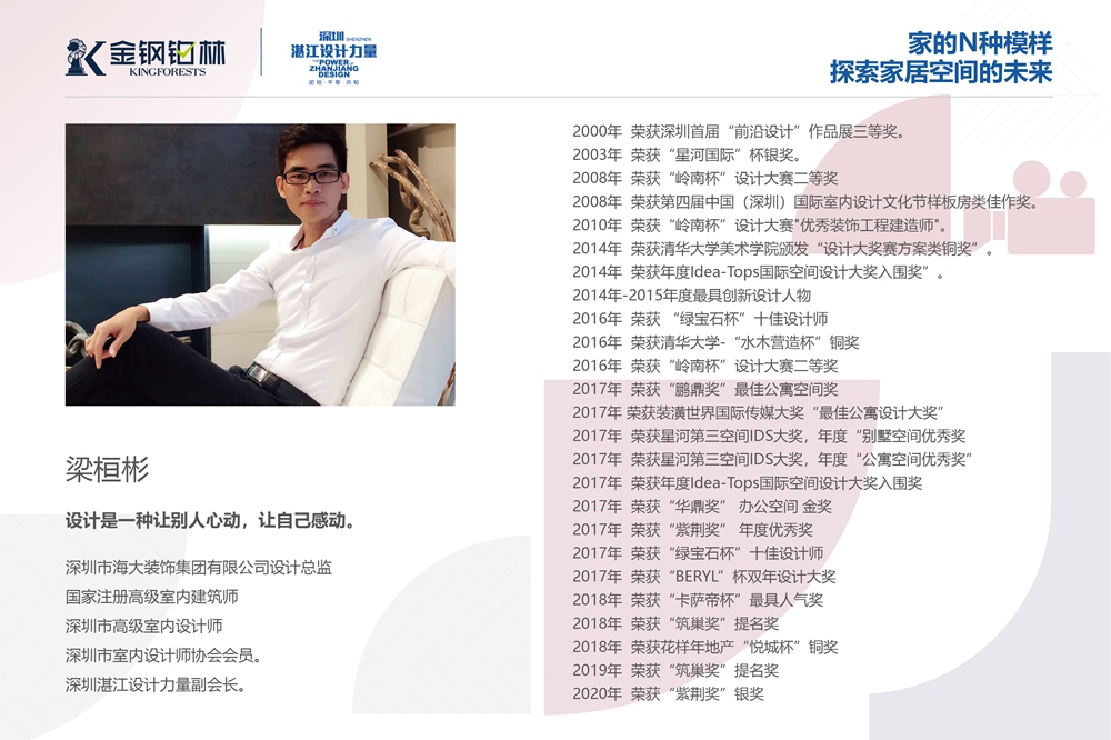金钢铂林从事进口地板领域25年,从环保、工艺技术、原创设计、人文和自然等多个维度甄选欧洲品牌木地板,每个品牌都是该品类地板的典范。湛江设计力量通过设计展现高端艺术和美学,演绎未来家居生活、商业空间的理想图景。让我们一起期待金钢铂林的艺术地板与湛江设计力量的各位设计师作品们发挥出关于家的N种模样的想象力。