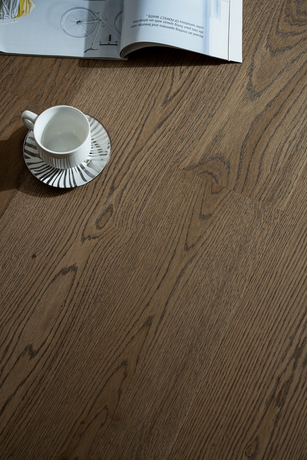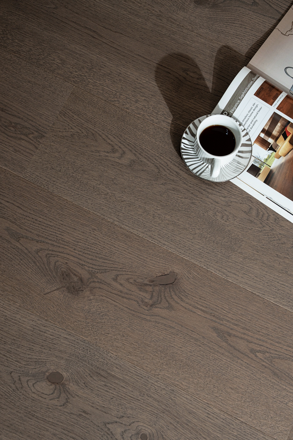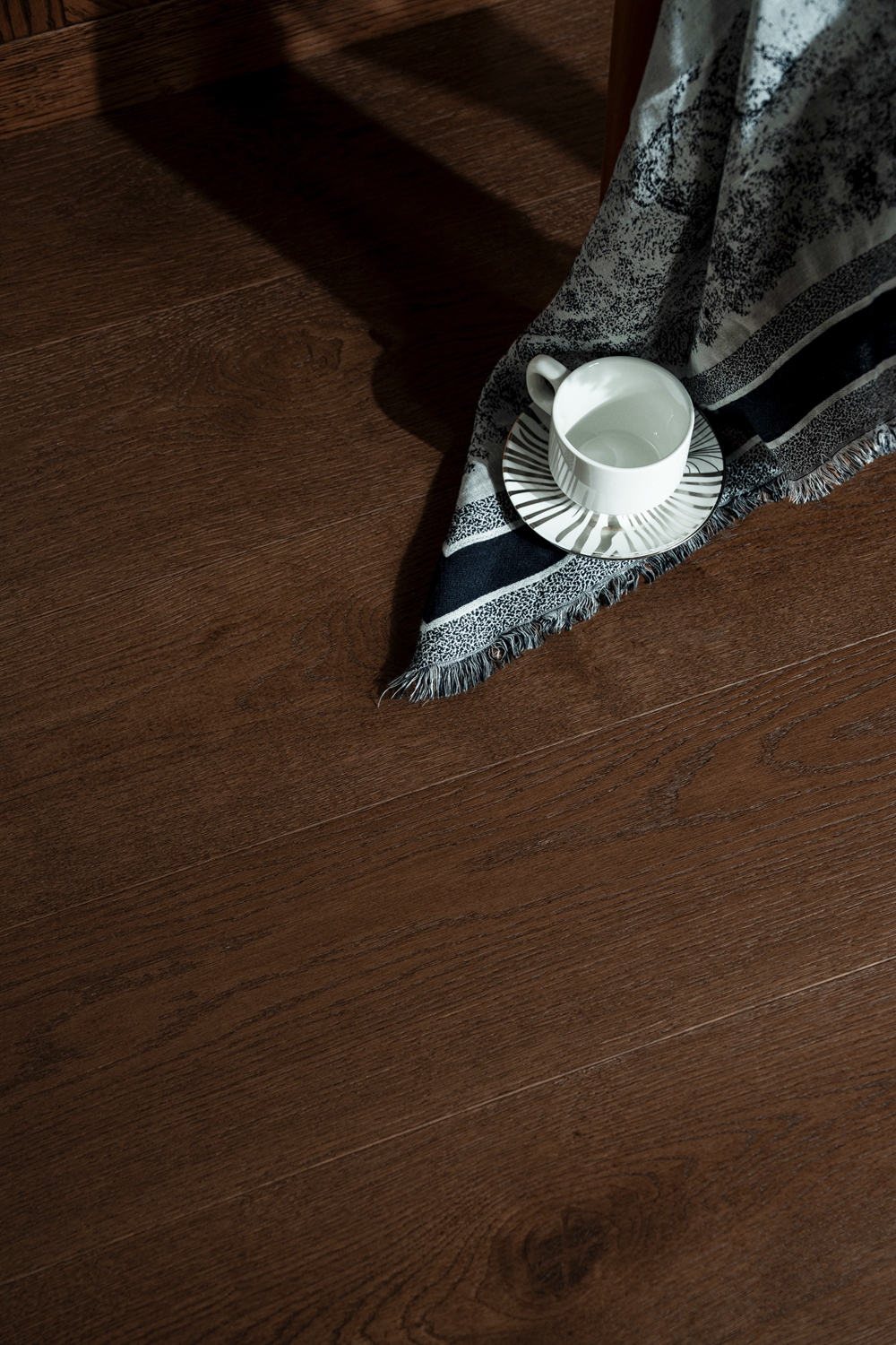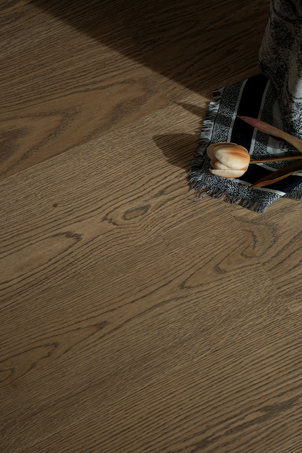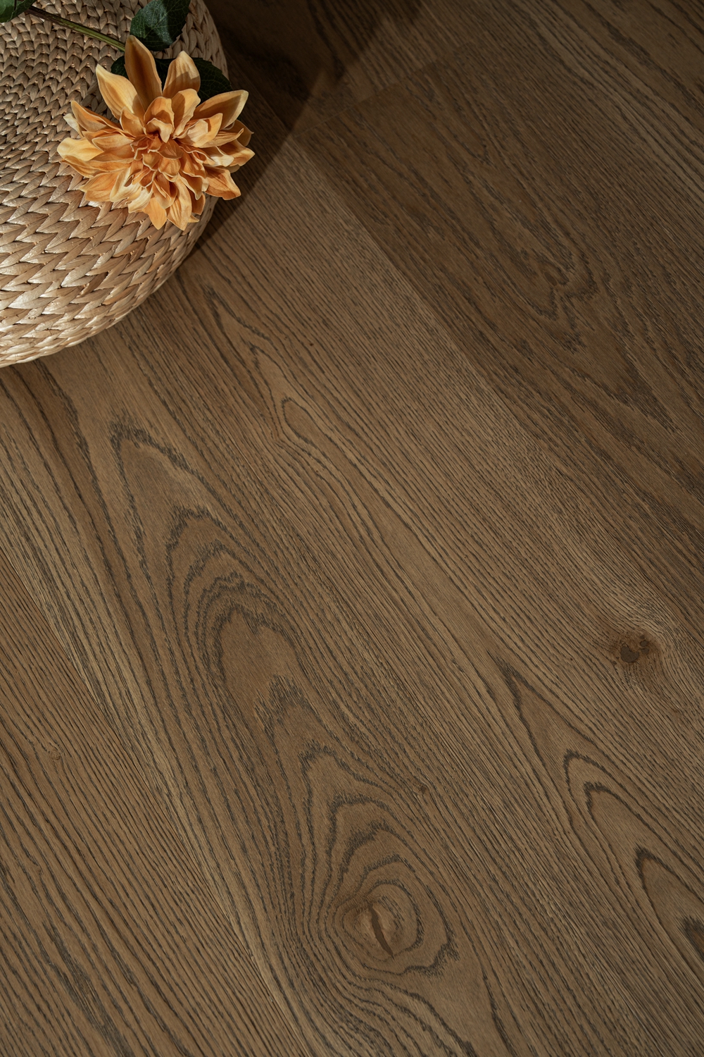 深邃浓郁的棕色,宛如历经岁月沉淀的珍贵木质,展现出强烈的复古气息和自然魅力。天然色差与节疤点缀出自然的野性质感。赤足行走,木纹起伏间仿佛触摸到森林的呼吸,这种款地板的适配性极强,无论是中古风、老钱风还是美德拉风格,它都能完美融入。