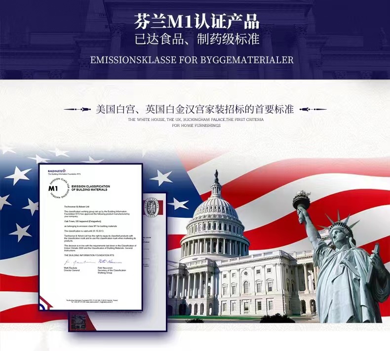 欧洲在环保领域一直走在世界前列,制定了严苛标准与认证体系。金钢铂林坚持高标准、高环保原则,旗下全线产品获有芬兰 M1(食品级安全)、德国蓝天使、法国 A + 等权威环保认证,实测数值高于标准,环保实力强劲。