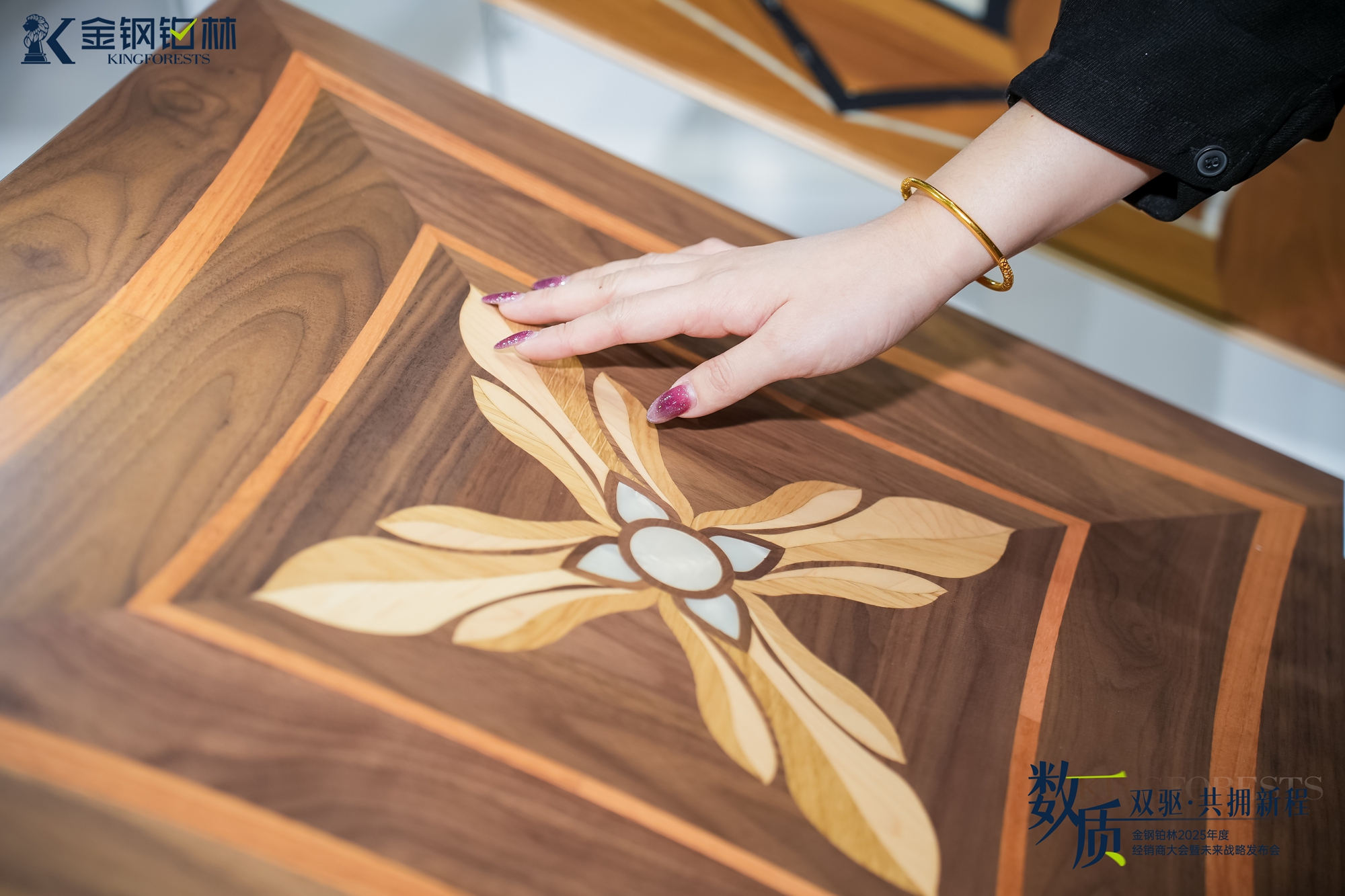 传承百年的手工拼花地板静静陈列,细腻的纹路、精湛的工艺尽显岁月沉淀的质感。新潮拼花设计则以大胆的色彩碰撞、灵动的图案组合,精准契合当代设计潮流,带来强烈视觉冲击。经典与当代的并置,不仅彰显金钢铂林深厚底蕴,更传递出持续进化的设计生命力。