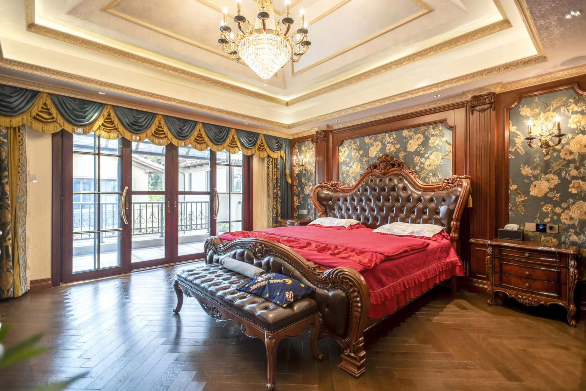 拼法是法式地板的灵魂!预算充足直接选人字拼或鱼骨拼,错落有致的拼接方式能拉伸空间延伸感,搭配 PU 线条、雕花吊顶,瞬间拉满法式高级感;预算有限可选通铺直纹,但需注意纹理要细腻,避免大花纹导致空间杂乱,同时可通过踢脚线的精致设计弥补拼法的简约。