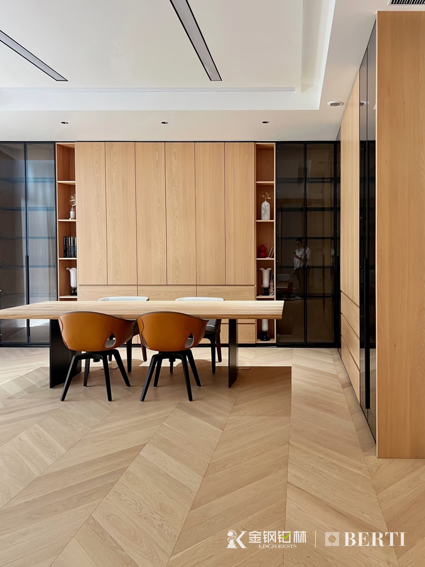 金钢铂林Berti还为客户提供定制化服务,从木种、颜色到拼花工艺,都能根据主人的喜好量身打造,让每一片地板都成为独一无二的专属标识,展现主人不凡的审美格调。