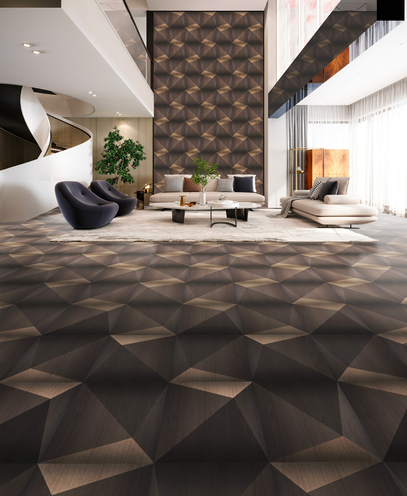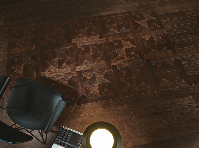 如通过对珍贵木材的手工染色以及设计突出人们对个性化的需求,匠人们将色彩深浅不一,3D立体几何的地板巧妙地结合在一起,不仅令地板的风格有了极大的跳跃性,更创造了独一无二的奢华与舒适并存的家居环境。